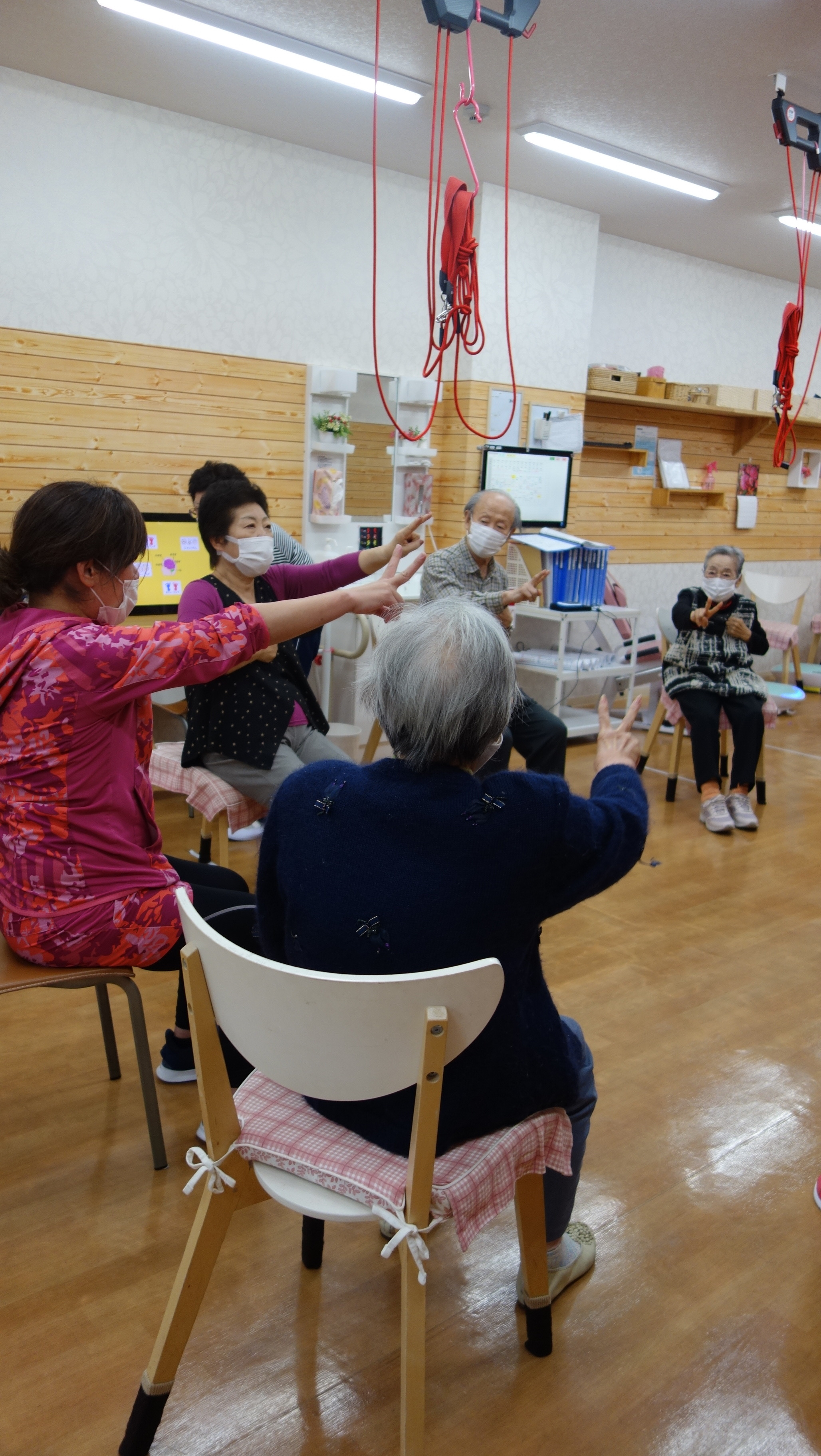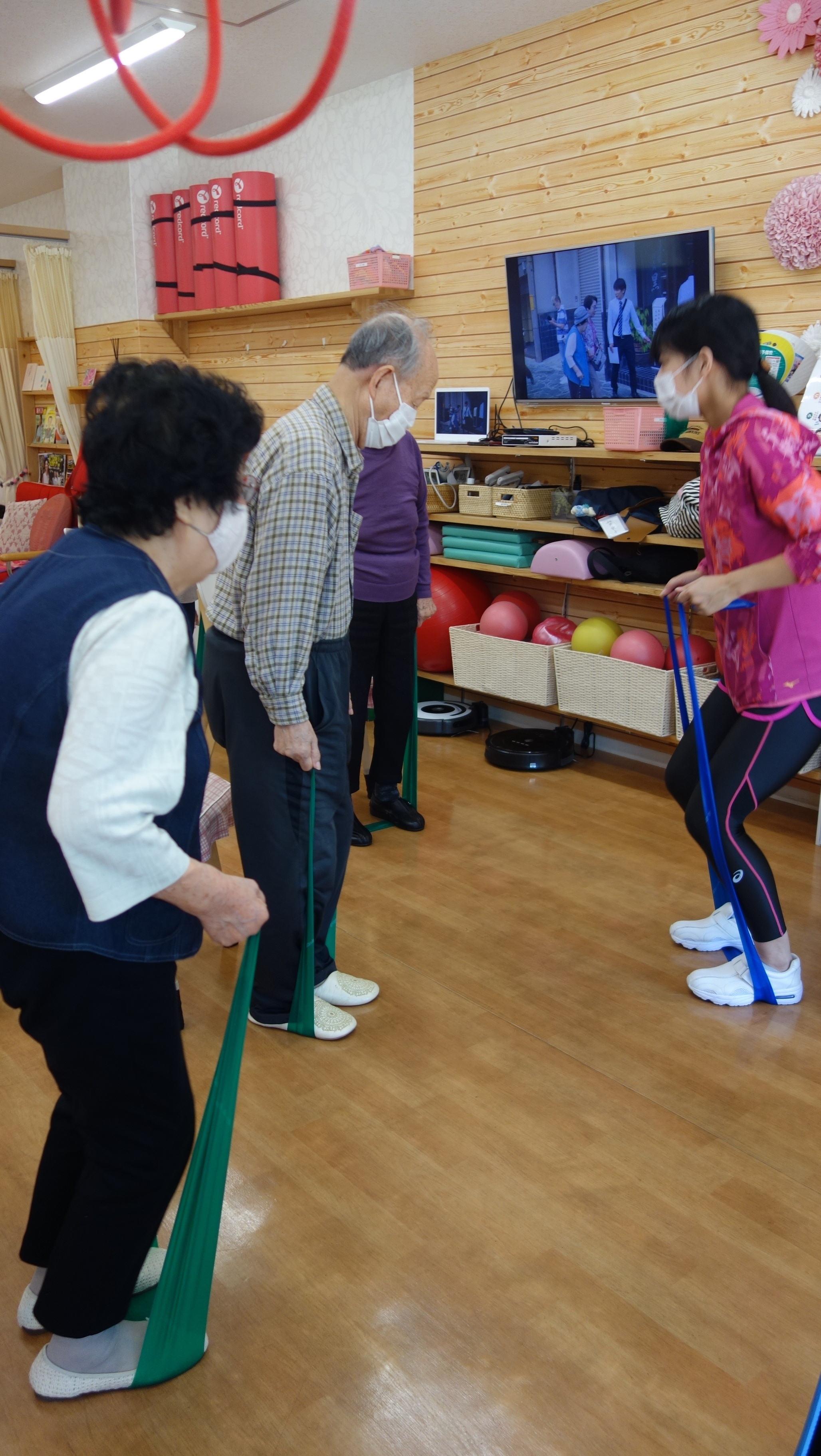 セラバンドを活用して体幹を捻ることで体幹筋や腕の筋肉を鍛えることができます。背もたれや肘掛けがないと椅子に座るのがきつい高齢者には、この体幹を鍛えることで椅子に座った姿勢を安定させる効果も期待できます。
